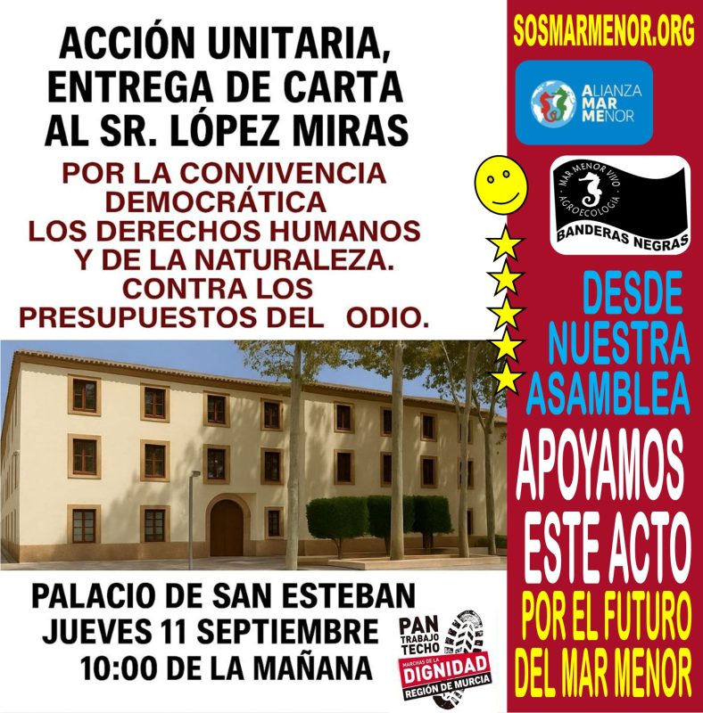 Los colectivos sociales han intentado trasladar al presidente de la Región, Fernando López Miras una carta con propuestas para mejorar la vida de la sociedad después del retroceso que, en su opinión, suponen algunos de los acuerdos alcanzados con VOX. Una carta que no han podido entregar personalmente al presidente, pero que han dejado depositada en la sede de presidencia.